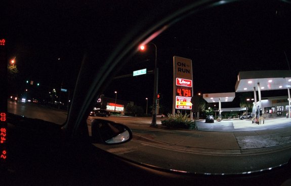 Fishete out the window looking at a gas station with expensive gas. Fujifilm Superia X-Tra 400