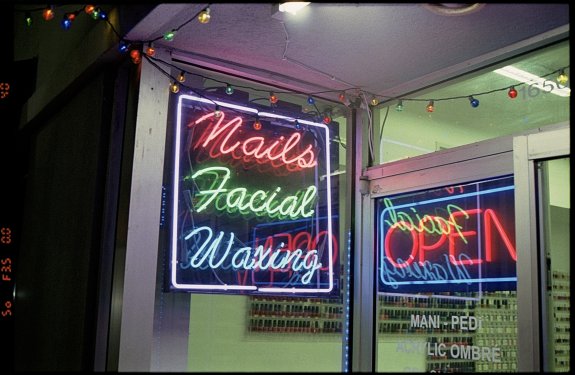 Store with a bunch of different light types: Neon, LED, Fluorescent Bulbs and Color Christmas Lights. Lomography Color Negative 100 photographed on the Nikon F6