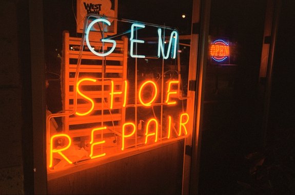 Gem Shoe Repair neon sign in South Miami Florida. Lomo 800 film. Nikon F6